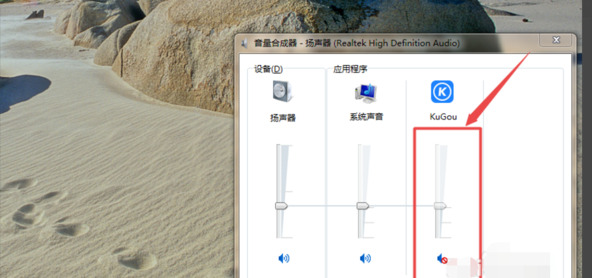 步骤4、点击了右下角的 扬声器 图标,在出现的小窗口中点击 合成器 选项,然后在打开的页面中可以看到 酷狗 静音了,点击一下那小喇叭,这时候发现酷狗可以正常播放了。