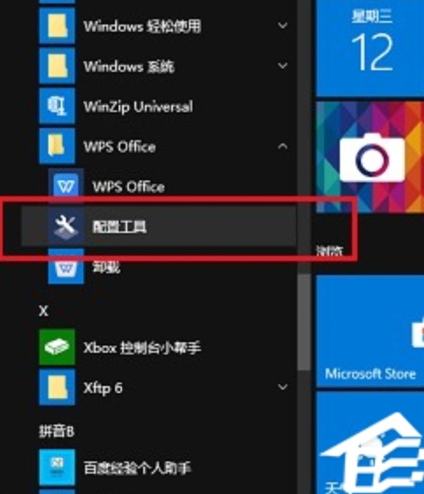 第一:首先,在桌面上点击开始菜单,找到系统中安装的WPS软件,点击“配置工具”菜单选项。