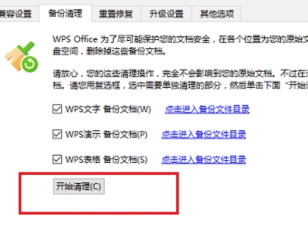 步骤5、、最后点击备份清理,勾选所有,点击开始清理,清理完成之后,重新启动wps,就解决wps总是卡慢的问题了。