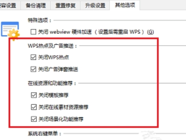 步骤4、、接着在其他选项中,关闭wps热点和广告推送,所有功能推荐,如下图所示。