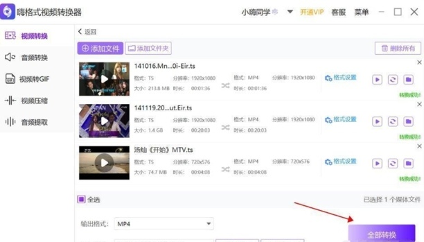 步骤4、最后通过“全部转换”功能按键,开始进行ts视频格式转换成";mp4";。mp4视频文件转换成功后,“打开”即可。