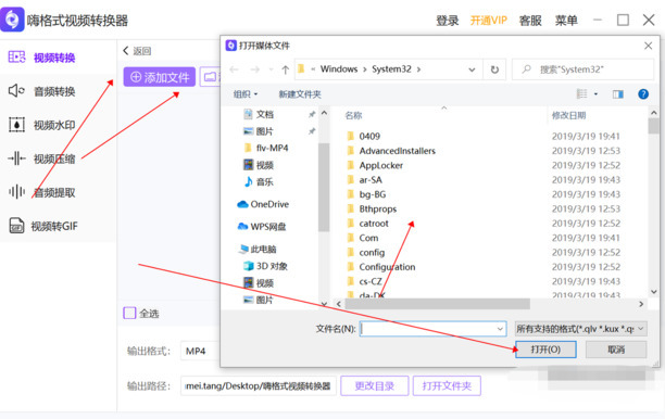步骤2、在“视频转换”显示功能窗口里,点击“添加文件”紫色按钮,弹出选择文件的文件夹,选择所需格式转换的ts视频格式文件,并点击“打开”按钮,关闭窗口,等待文件上传。