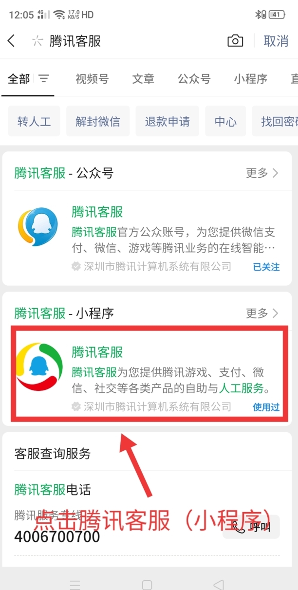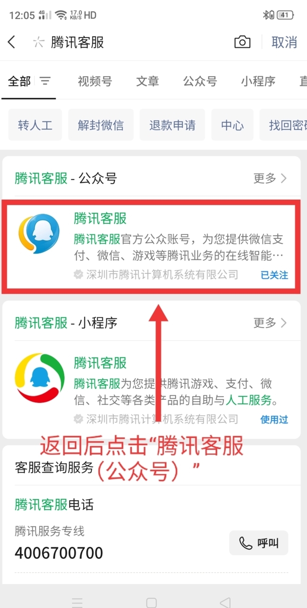 第三:在搜索框内输入腾讯客服,点击进入公众号。