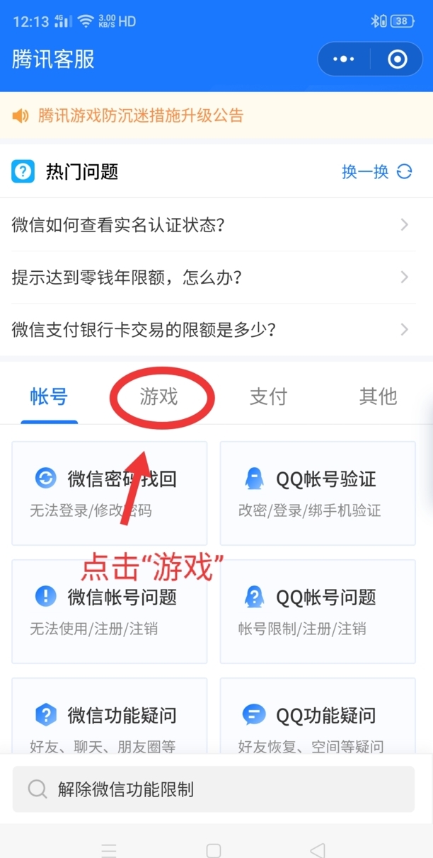 5、进入小程序腾讯客服后点击“游戏”