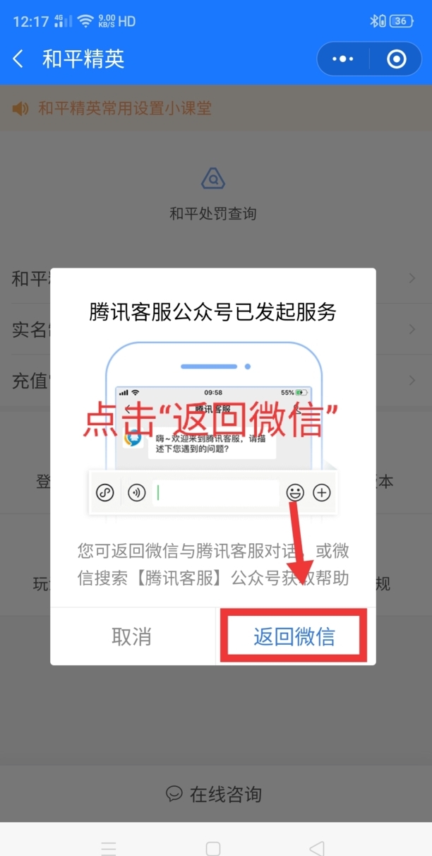8、点击后会弹出一个页面,看到上面写的是“腾讯客服公众号已发起服务”就点击“返回微信”