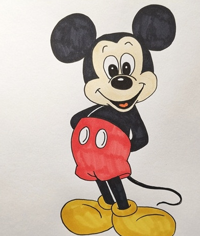 5、再来给它的面部涂肤色,裤子涂红色,鞋子涂黄色,简单的米老鼠简笔画就完成啦!