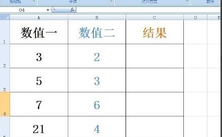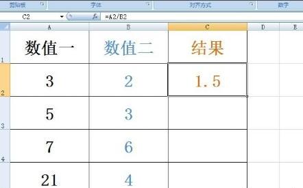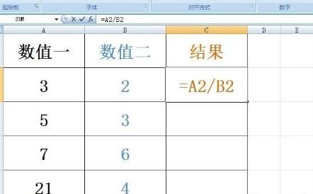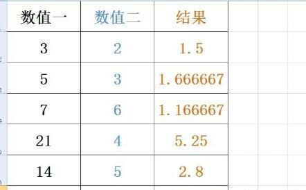 1、创建一个Excel工作表,填入数值一、数值二两列,开始进行第三列的除法数值计算。