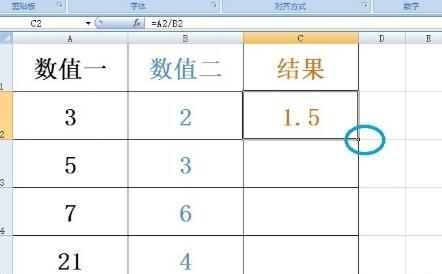 3、点击回车键,得出A2除以B2的乘法数值结果。
