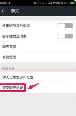 4、聊天界面中点击下方清空聊天记录。当然也可以对聊天记录备份后清空。