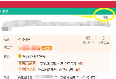 1、打开淘宝网,登录账号,找到要举报的淘宝店铺,来到指定的宝贝页面,找到角落处的“举报”二字。