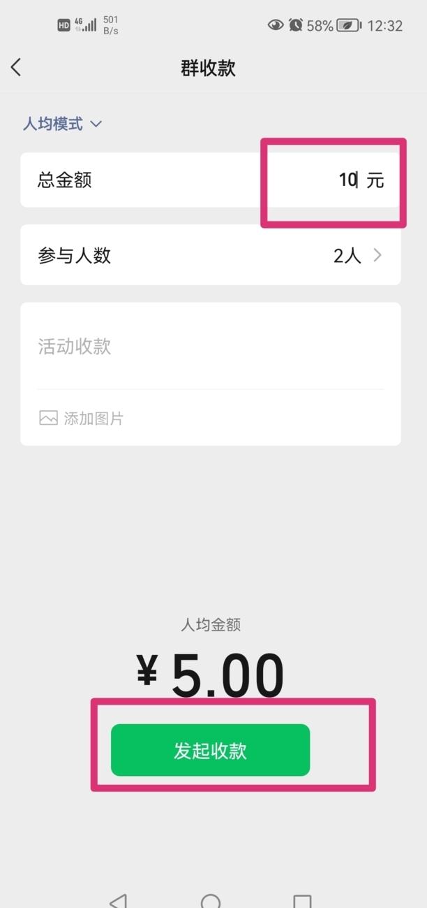 第四:在群收款页面中,有两种收款方式:总金额人均式、按人填金额式,点击第一栏下方的深色小字可以切换这两种方式。