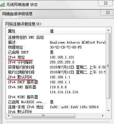 可以看到“ipv4"和“ipv4默认网关”。一般“ipv4默认网关”就是我们的路由器设置页面的IP地址。如图。
