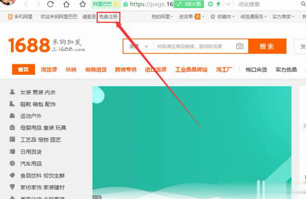 步骤1、、首先在浏览器上搜索“阿里巴巴”网站,打开,进入主页面。在页面上找到“免费注册”,点击它。