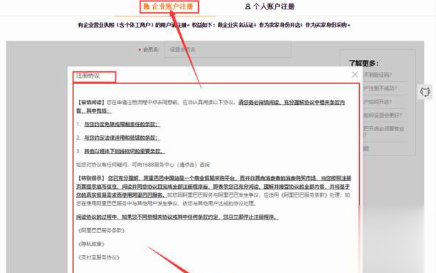 步骤2、、点击免费注册后,选择“企业账户注册”,会出现如图所示的提示;要详细的看看哦,看完了就点击下面的“同意协议”按钮。