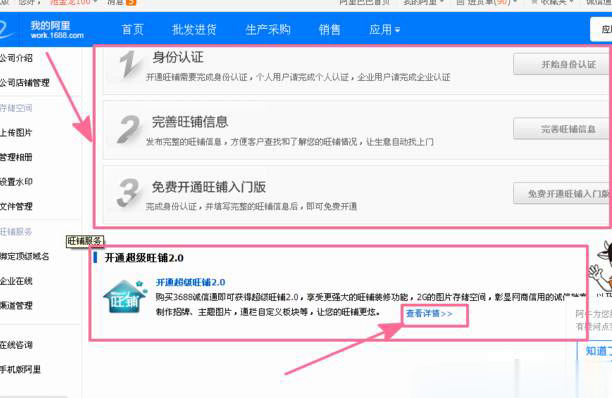 步骤7、、点击后,在出现的页面中,会看到相关的开通旺铺的一些相关信息说明,以及一些详细资料。点击下面的一个“查看详情”。