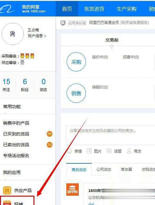 步骤6、、进个人中心,在左侧可以看到有一个“旺铺”按钮,如下图