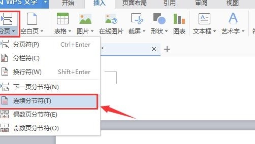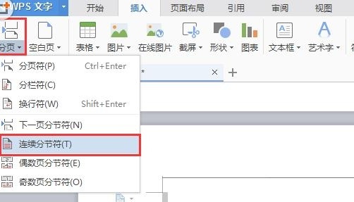 步骤2、、选择菜单栏中的“插入”,选择“分页”的图标,在下拉菜单中选择“连续分节符”选项。