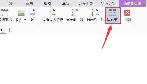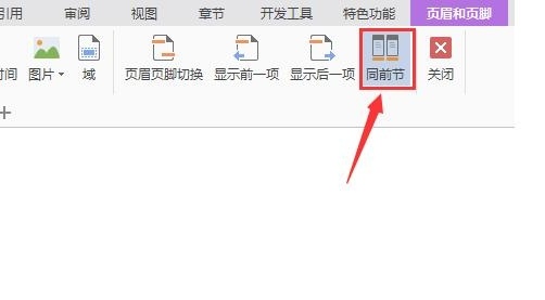 步骤5、、添加完毕后,光标依旧在处理页面的下一页,例子中就是第三页;选择菜单栏中的“页眉和页脚”。此时会发现,在上方的标题栏中,有一选项“同前节”处于选中状态,点击取消该状态。