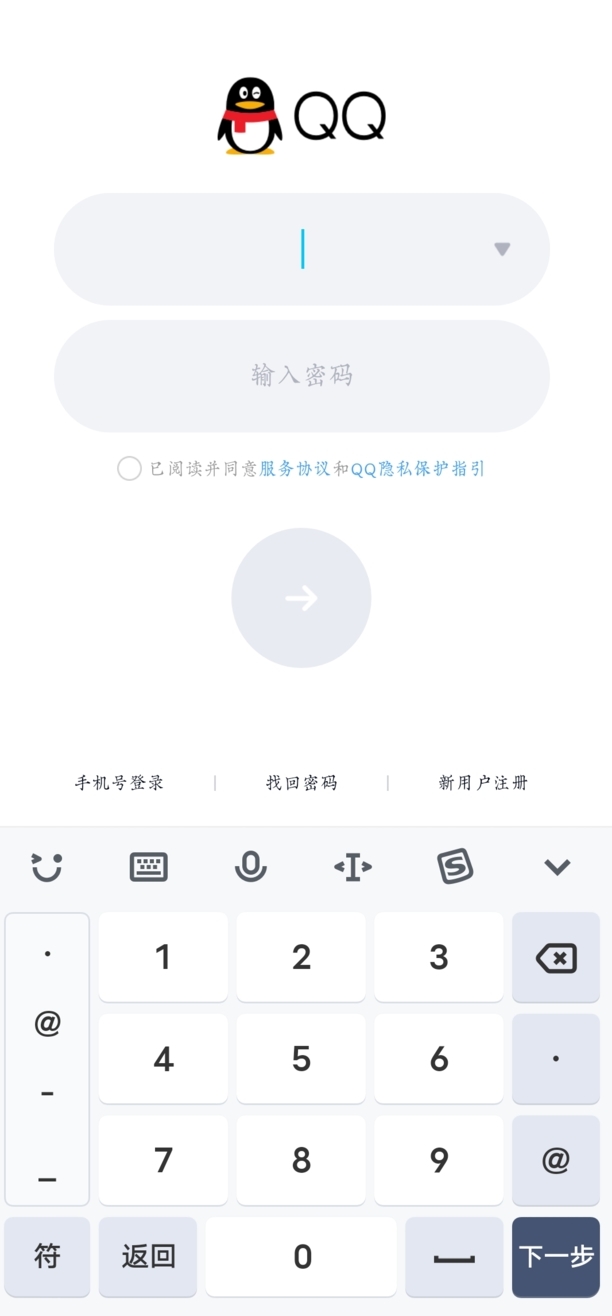 步骤2、进入app后,出现登录页面,如果使用QQ登录,有QQ账号的话输入账号登录即可,如果没有账号就需要注册一个新QQ。