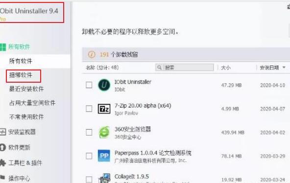 有些流氓软件用普通的卸载方式还是难以卸载干净,这时就需要一些专业的软件来处理,Iobit Uninstaller中文版是一款添加/删除程序的软件,使用很简单而且免费,安装之后,打开页面就可以找到流氓软件卸载干净了。