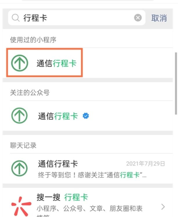 1、打开微信,在搜索框中输入行程卡小程序并进入。