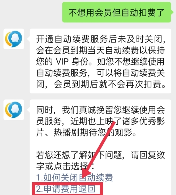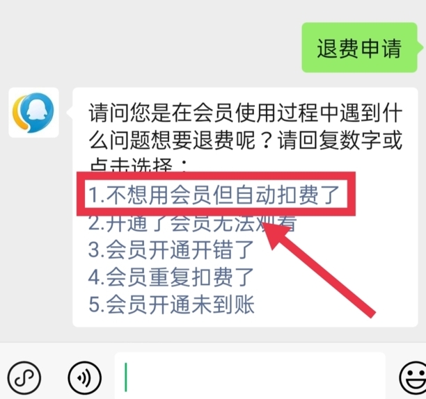 2、在对话框中发起退费申请,选择发送不想用会员但自动续费了。