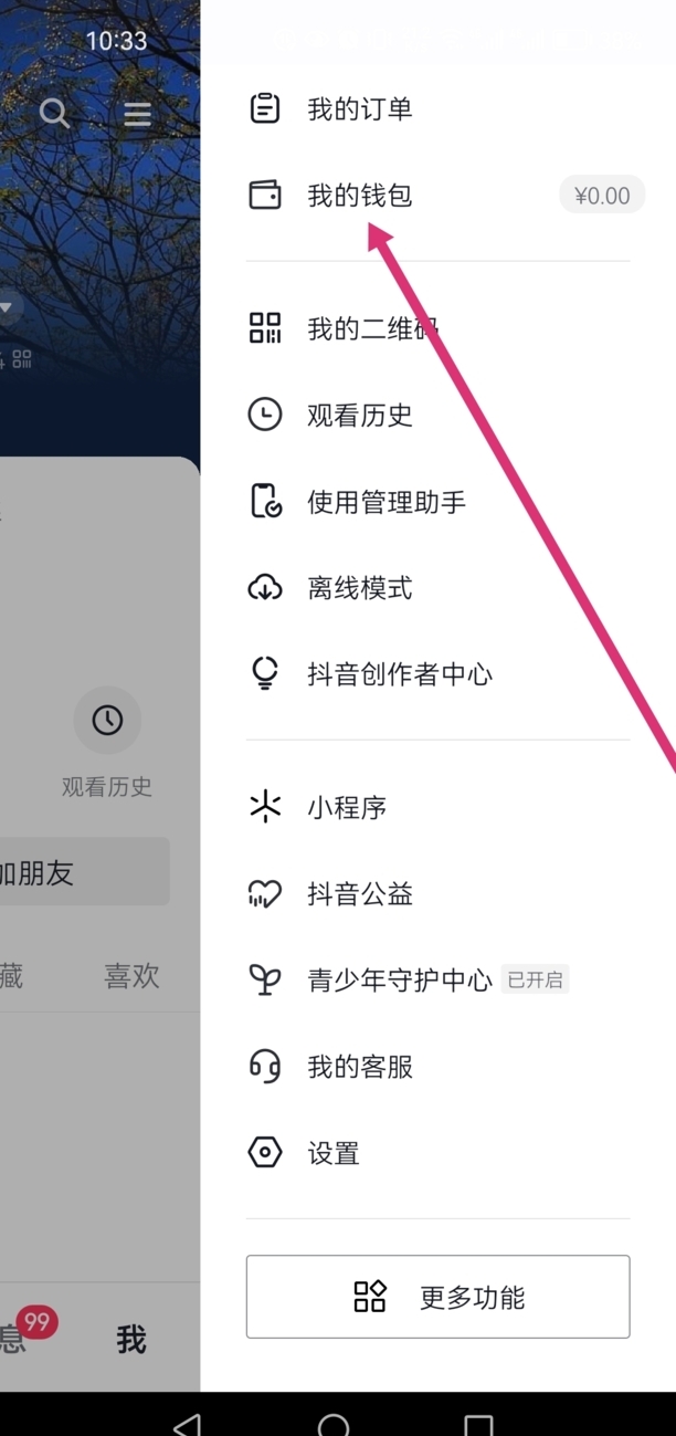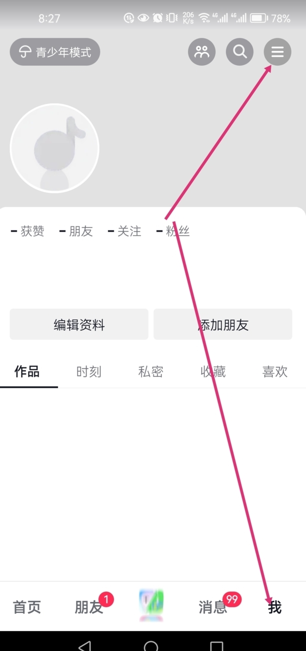 1、首先打开抖音,点击右下角的我,然后点击右上角三横
