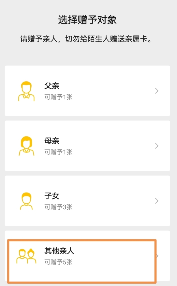 5、选择赠与其他亲人(其中包括女朋友)。或者直接相对应的微信号。