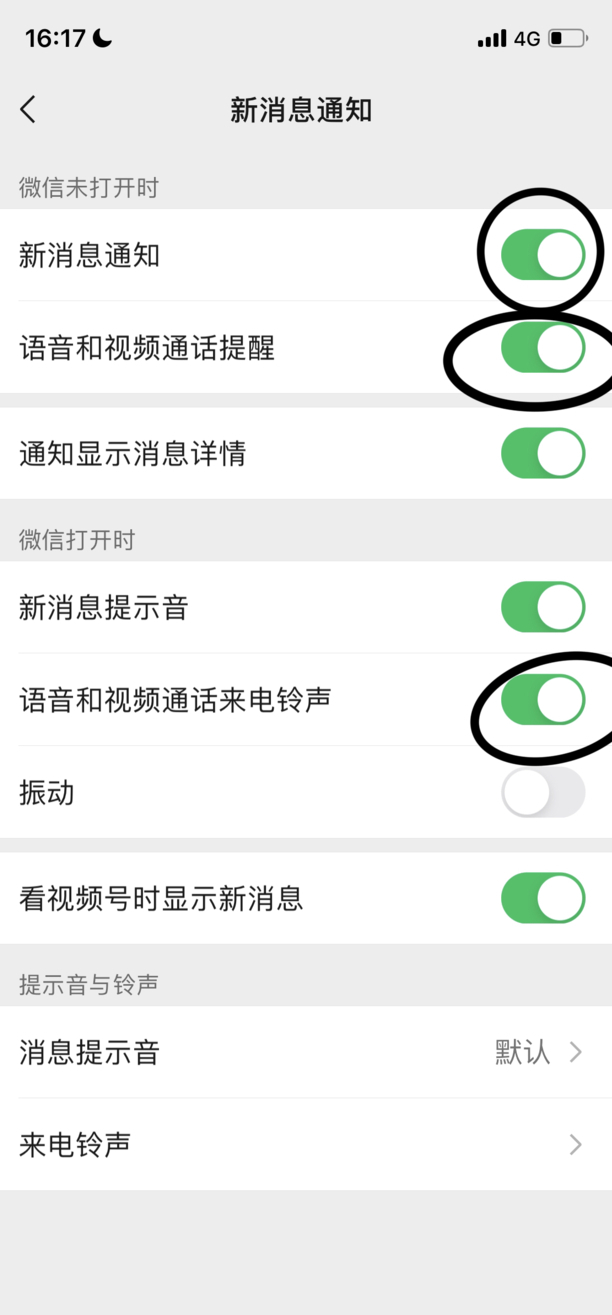 3、打开新消息通知,同时打开语音和视频通话提醒和铃声。打开之后当对方发起视频时就能听到声音了。