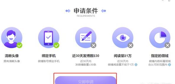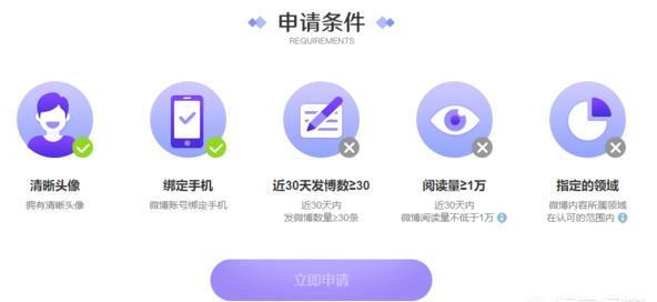 第七:点击“身份认证”后在身份认证页面完成申请条件,点击“立即申请”即可完成微博实名认证,