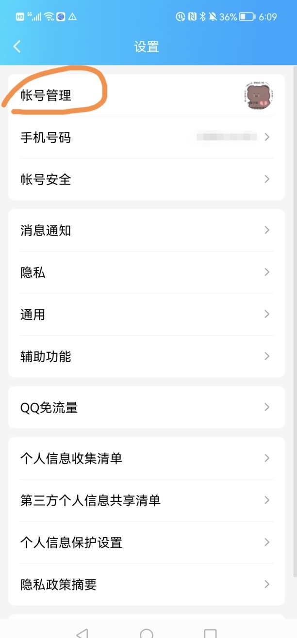 3、在手机QQ的设置界面里,找到“帐号管理”选项,点击它。