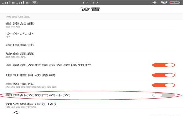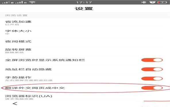 点击设置功能,进入到设置页面,找到翻译外文网页成中文,如图