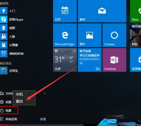 7、然后点击左下角开始,再点击电源,然后点击重启即可