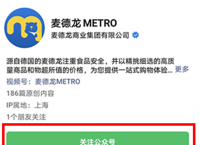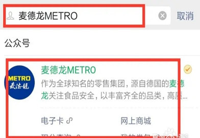 第二:输入并搜索【麦德龙METRO】,点击搜索结果进入公众号。