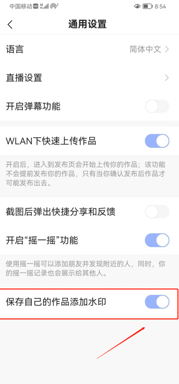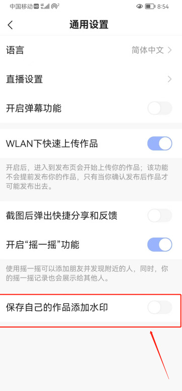 4、在里面把【保存自己的作品添加水印】这个蓝色的按钮关闭;