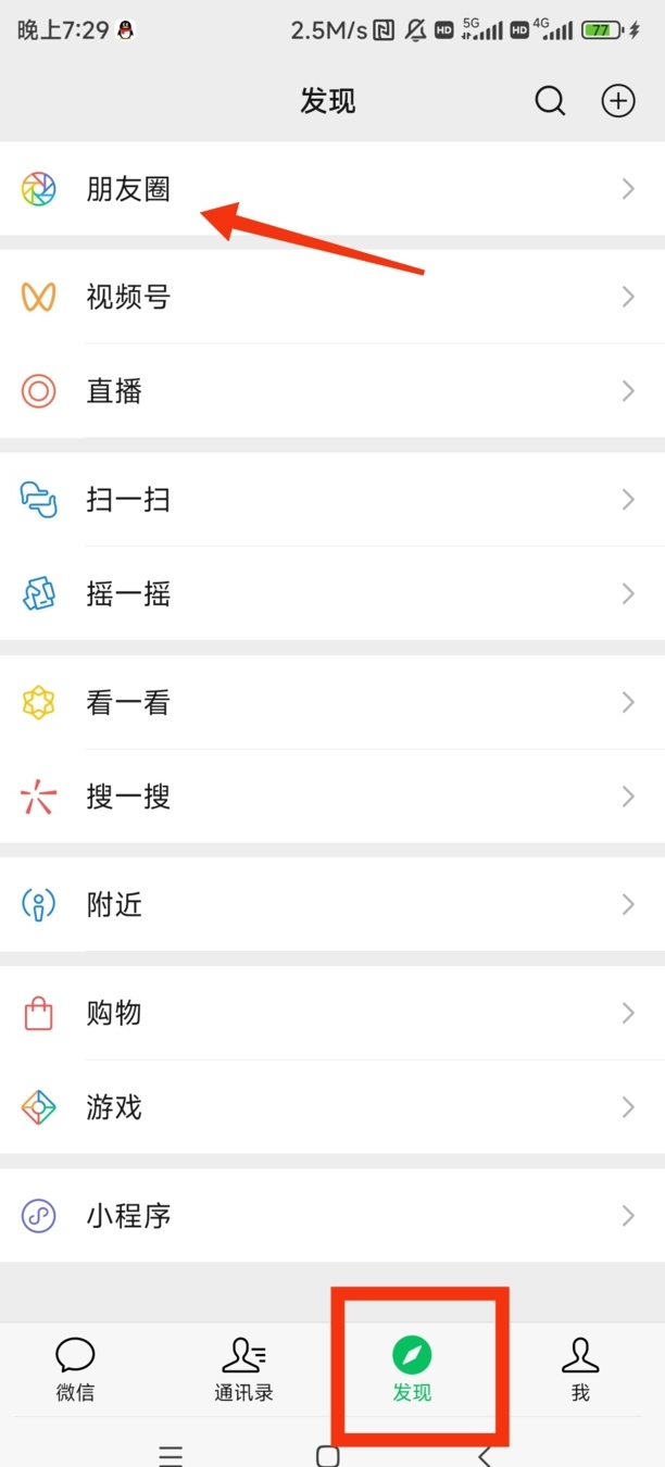 1、以小米 11为例,首先打开手机微信,进入发现页面,点击朋友圈选项,进入点击微信背景图。