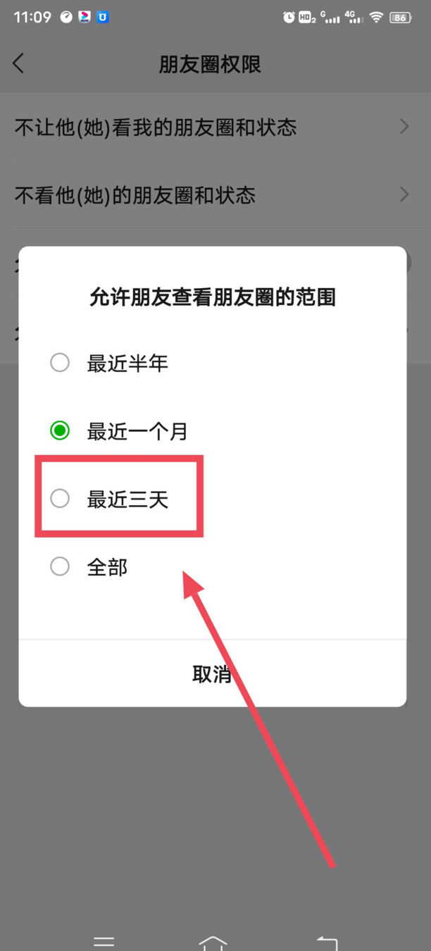 4、点击允许朋友查看朋友圈的范围,选择最近三天即可。