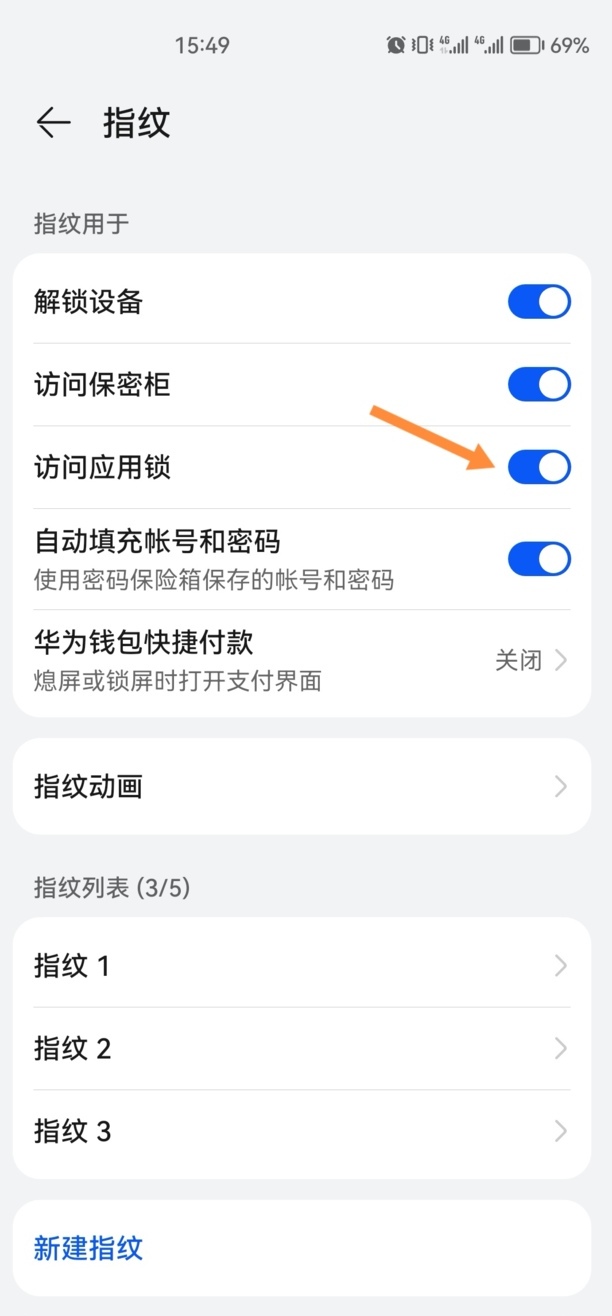 第四:接着在指纹管理界面找到“指纹使用于”里的“应用锁”点击打开。
