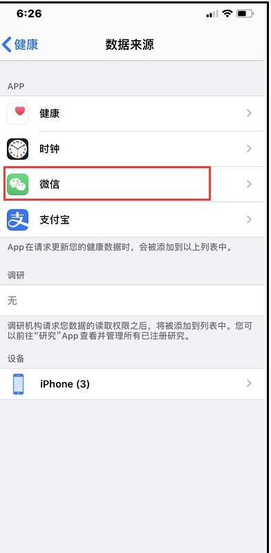 点击数据访问权限与设备,进入页面后选择页面后就可以选择数据来源了,这里就会出现时钟、支付宝、微信这些,这时候选择微信就可以了。