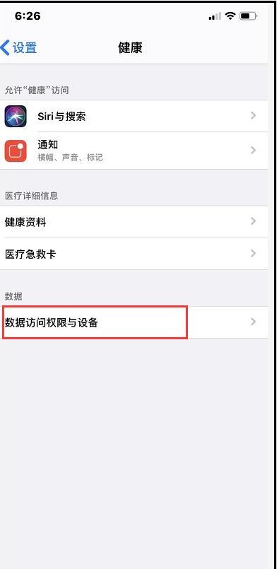 打开<;健康>;页面后,就会看见这样的操作页面,在这页面中点击<;数据访问权限与设备>;,如图