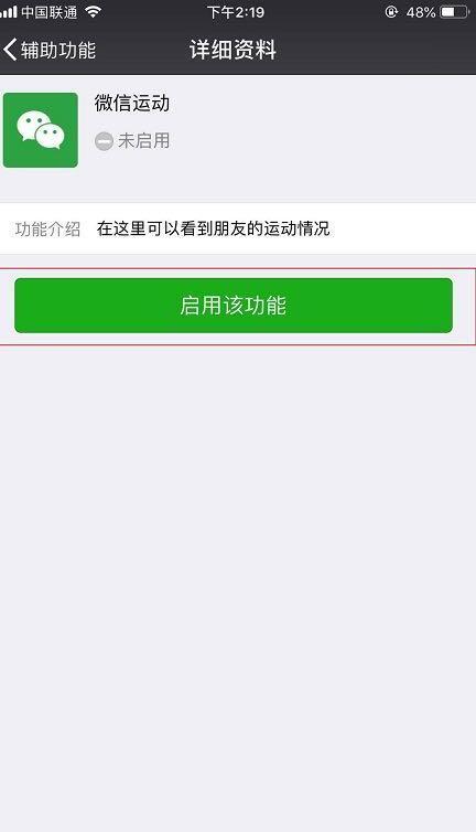 第四:可以看到微信的辅助功能里有“微信运动”一栏,我们点击一下,然后在页面中点击“启用该功能”即可。