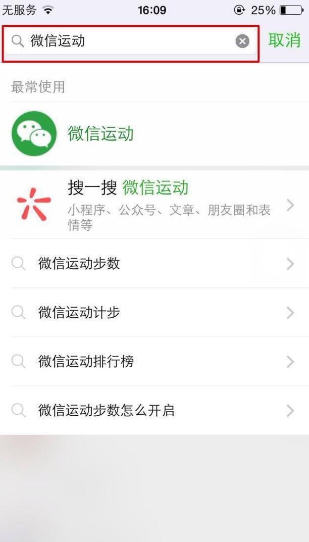 然后在这个搜索框中手动输入<;微信运动>;,在弹出来的页面中选择第一个,如图: