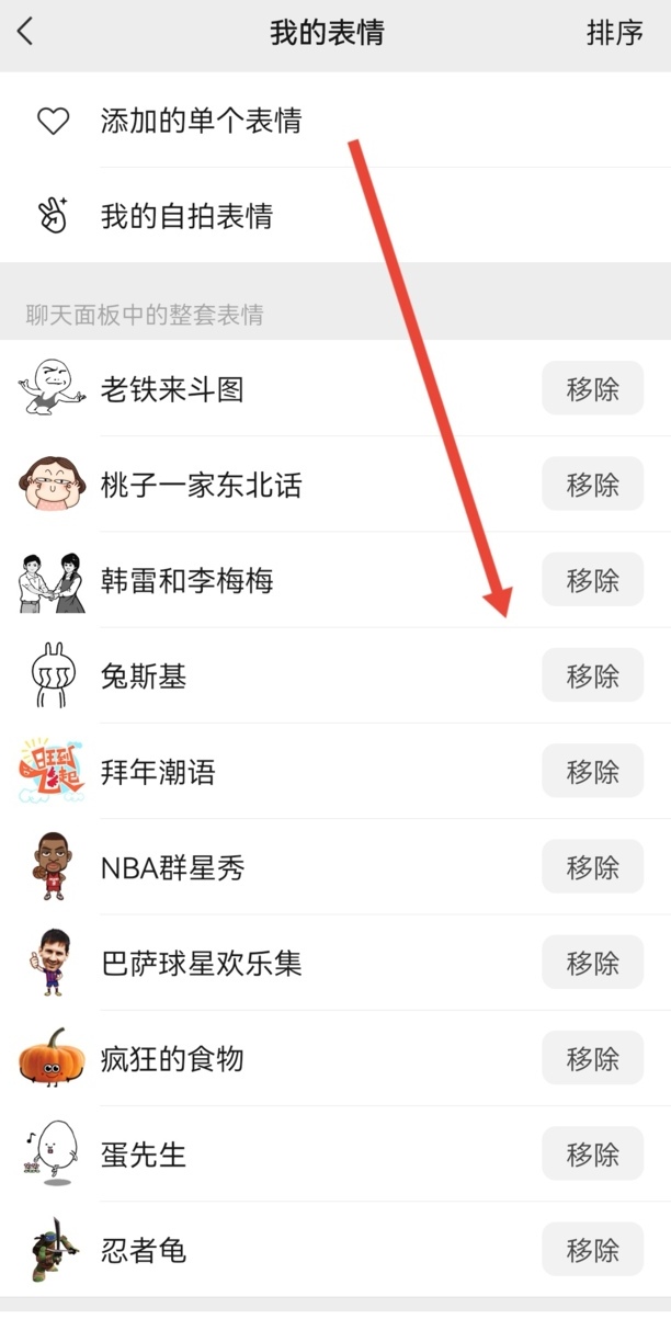 第四:点击需要删除的表情包专辑右侧的“移除”选项即可。