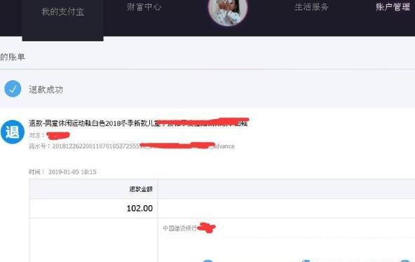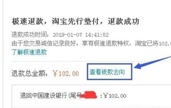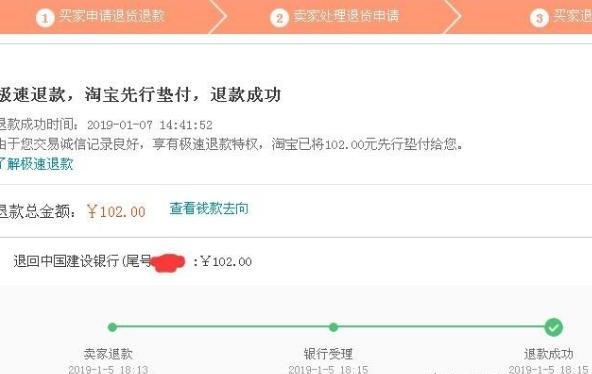 4、接下来,我们可以看到淘宝界面显示退款成功的字样,还有退款去向,比如图中显示退款到建设银行卡。