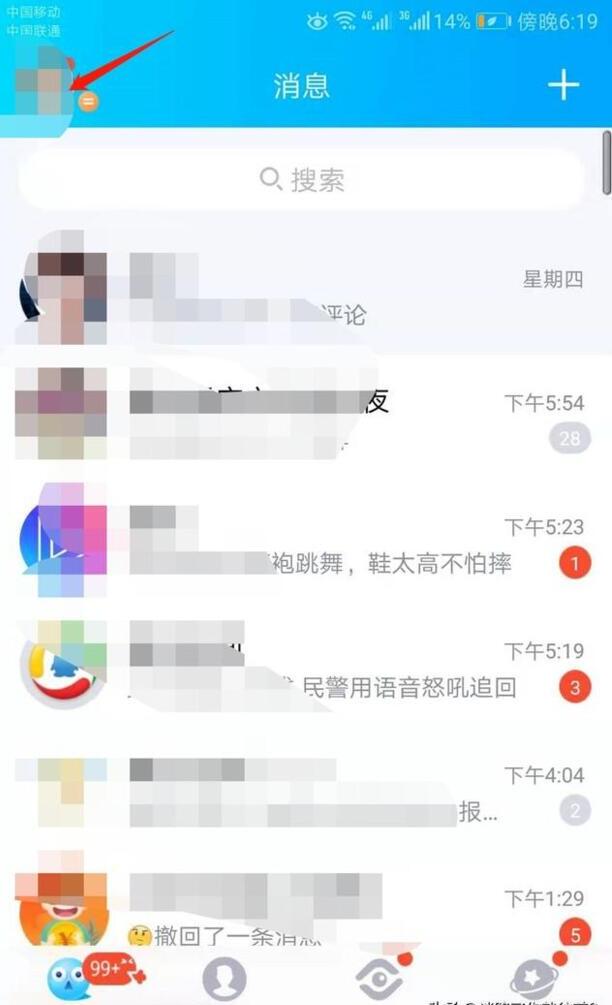 接着,进入QQ消息界面,点击左上角的头像,如下图所示