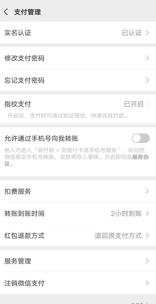 第六:返回到刚才的支付管理页面,即可看到微信转账到账时间已经发生了改变,从起初的实时到账到现在的24小时到账了。