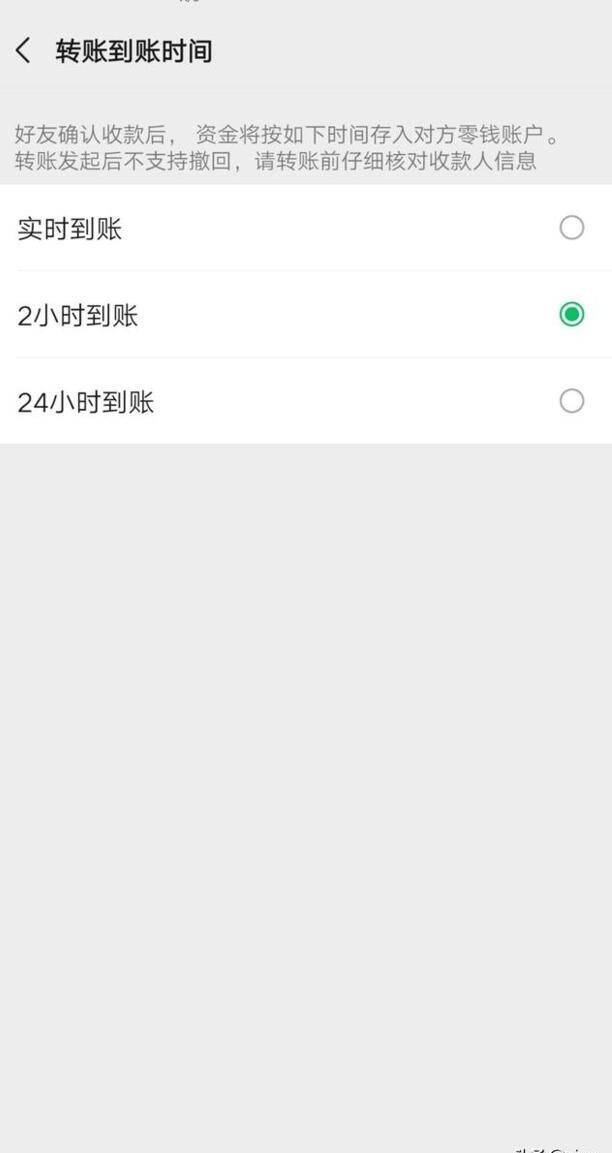 3. 在这个新界面,可以设置两个小时后到账,还可以设置24小时到账,想要设置哪一个,就点一个,看见右边的圆圈变成实心的绿色,就代表设置成功。