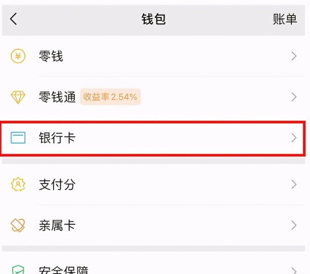 4、在“钱包”界面,点击“银行卡”选项,进入“银行卡”设置界面。