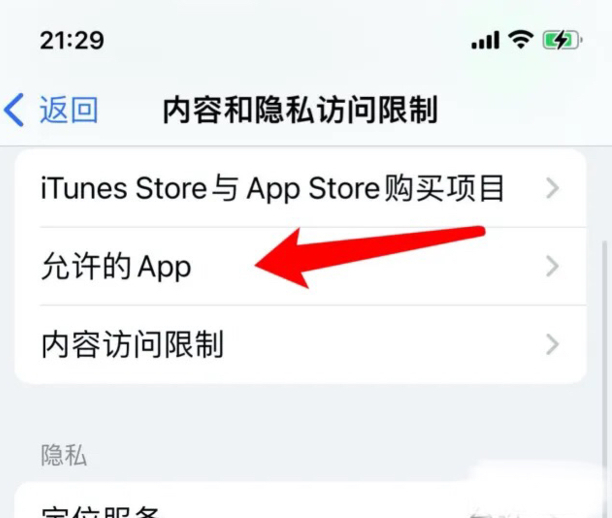 步骤3、在内容和隐私访问限制页,进入“允许的App”设置界面。