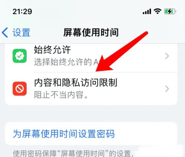 步骤2、在屏幕使用时间界面,点开“内容和隐私访问限制”页。